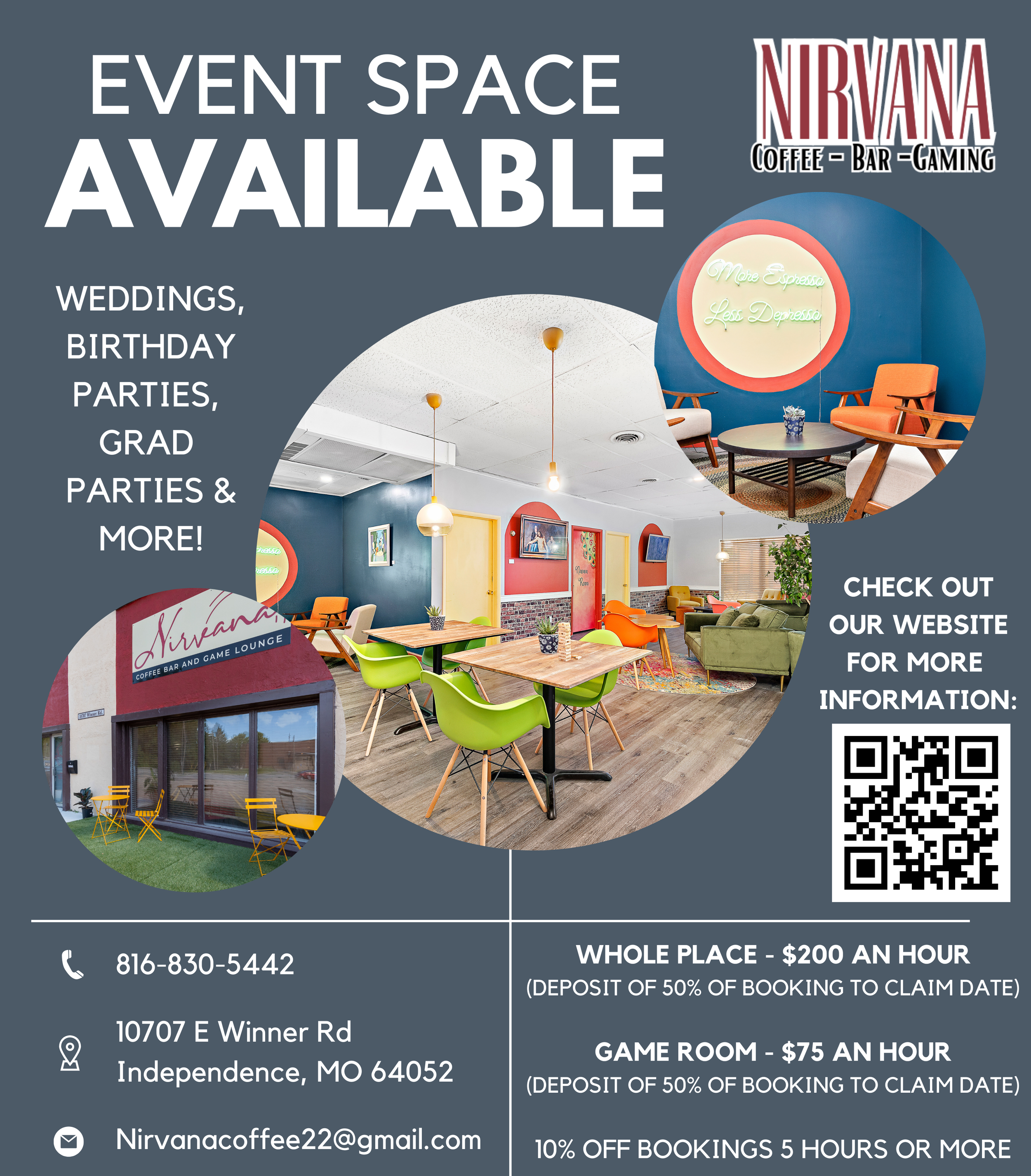 Nirvana Coffee Bar & Game Lounge is a cozy café in Independence, Missouri, where expertly crafted coffee meets a fun, relaxed atmosphere filled with board games, live events, trivia nights, and community gatherings.